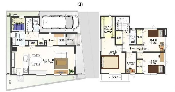 | 間取り詳細 | 洋7.7帖/洋5.1帖/洋5帖/帖/LDK17.7帖/WIC3帖 |