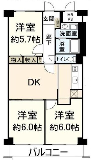 | 間取り詳細 | 洋6帖/洋6帖/洋5.7帖/DK |